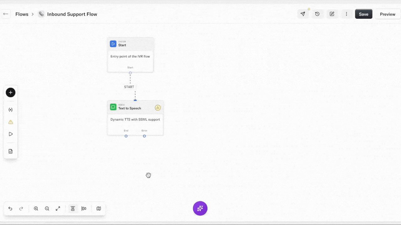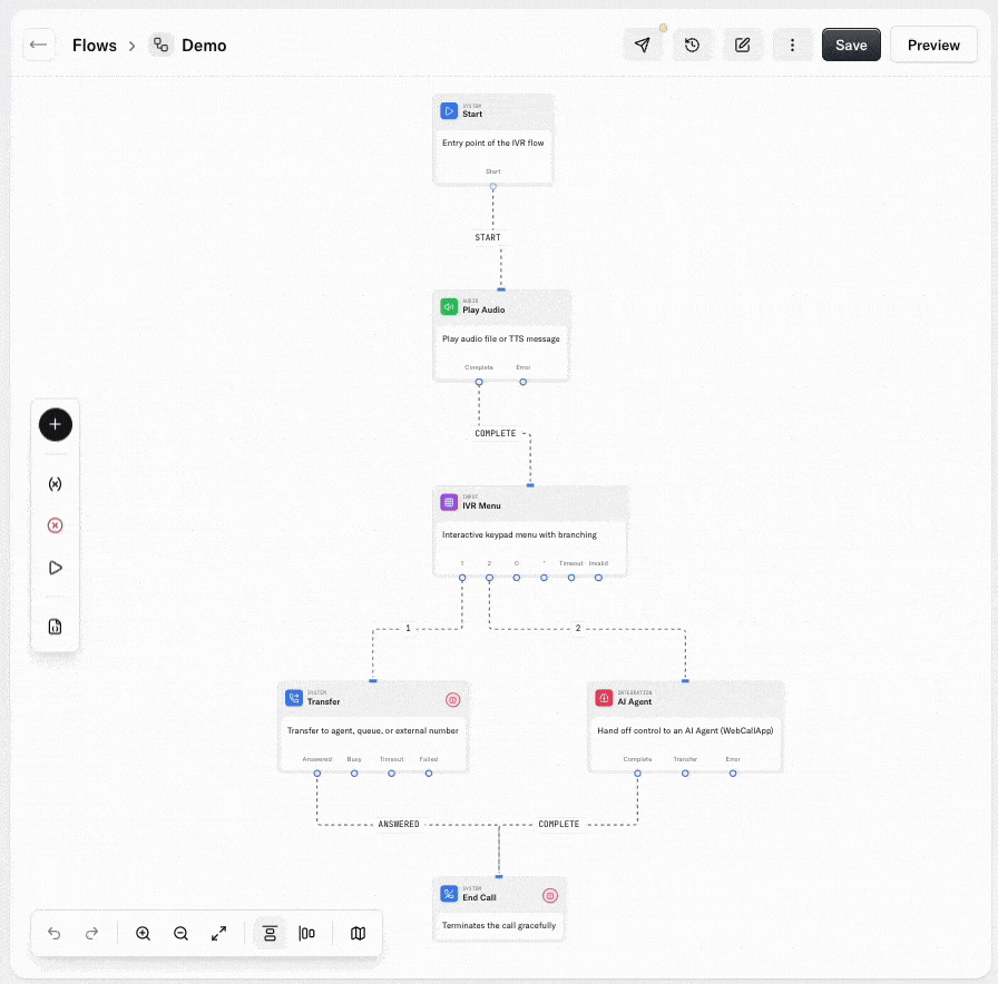 Flows is built around a drag-and-drop canvas. Every capability—whether it's an AI agent, an IVR menu, or a webhook—is represented as a node. You connect nodes to build paths, add conditions to create branches, and use loops to repeat steps until a condition is met.